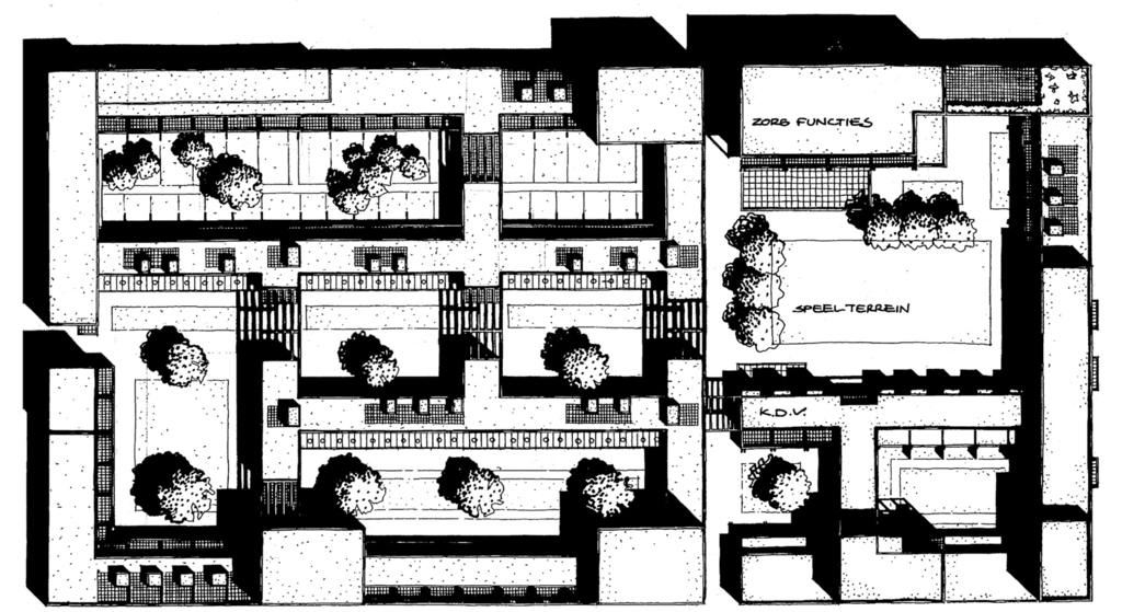 BMB: Het gaat bij Blok 29 wat mij betreft niet om spannende architectuur, maar om de publieke ruimte die we hebben gecreëerd. We hebben contrasten aangebracht. Wijds is pas leuk als er ook nauw is. Binnen het blok hebben we een beschutte wereld ontworpen met een aantal collectieve ruimtes die allemaal publiek toegankelijk zijn, maar verschillende gradaties van openbaarheid hebben. De architectuur faciliteert dat en hoe de ruimte klinkt speelt daarin een grote rol. De vormgeving en inrichting van de ruimtes binnen het blok verschillen met die van de straat door meer geveldetaillering, meer groen, het ontbreken van parkeervakken, de kleinere schaal en de omslotenheid. Dat levert met elkaar auditieve beschutting op.