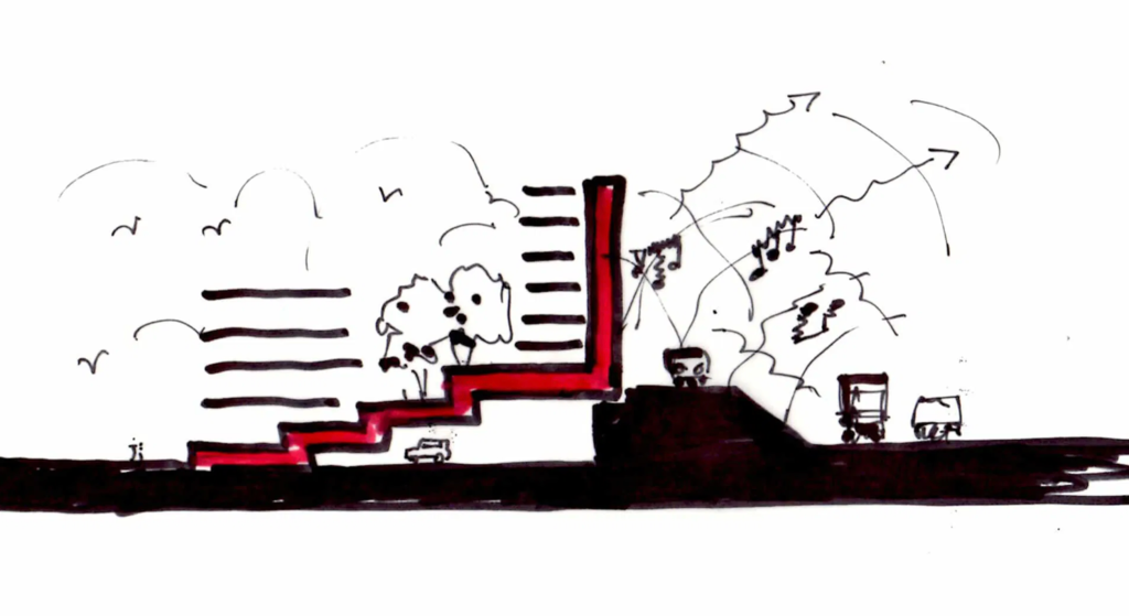 BMB: Het onderstaande, allereerste schetsje brengt goed in beeld wat we deden: we creëerden een ‘rug’ die een groot deel van het verkeersgeluid wegneemt – niet alles, want via de zijkanten lekte nog verkeersgeluid binnen. Dat moesten we dempen. Ook moesten we zorgen dat er geen staande golven zouden ontstaan tussen de bouwdelen. Dat was nog een reden om voor ronde vormen te kiezen. En ten derde hebben wij daar een park aangelegd. De perceptie van het park helpt om het nog hoorbare verkeersgeluid te accepteren. Je hoort het eigenlijk niet meer. Het is een beetje psychologische mascara, maar het werkt. Door deze drie ingrepen hebben we een ruimte gecreëerd voor positieve geluiden, voor andere gevoelens en voor sociale interactie.