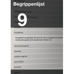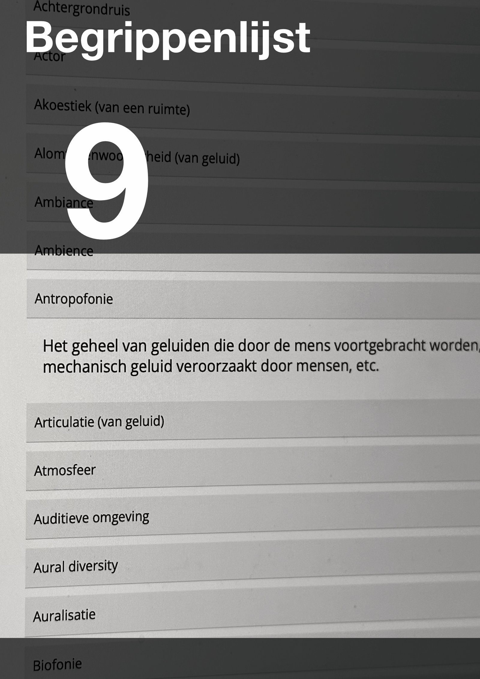 Het ontwerpen van geluid beslaat vaak meerdere vakgebieden, elk met een eigen jargon en concepten. Met name termen en begrippen uit de auditieve wereld zijn voor experts uit andere vakgebieden soms onduidelijk. Dit kan een goede communicatie met geluidsexperts in de weg staan. Daarom is in deze Inspiratiegids geluid een begrippenapparaat opgenomen, waarin de meest belangrijke termen uit de geluidswereld kort worden verduidelijkt.